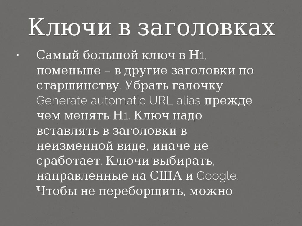 • Самый большой ключ в Н1, поменьше – в другие заголовки по старшинству. Убрать галочку Generate automatic URL alias прежде чем менять Н1. Ключ надо вставлять в заголовки в неизменной виде, иначе не сработает. Ключи выбирать, направленные на США и Google. Чтобы не переборщить, можно оставить какие-то заголовки в конце статьи не ключами.