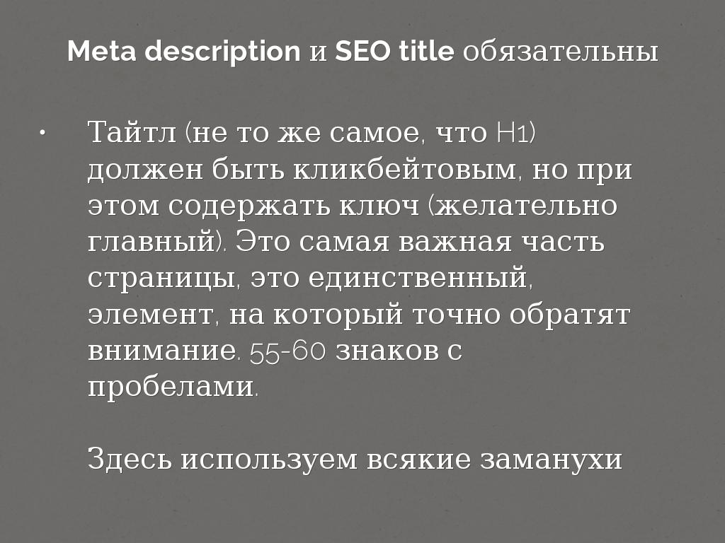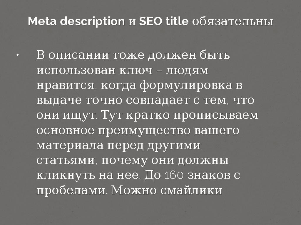 • В описании тоже должен быть использован ключ – людям нравится, когда формулировка в выдаче точно совпадает с тем, что они ищут. Тут кратко прописываем основное преимущество вашего материала перед другими статьями, почему они должны кликнуть на нее. До 160 знаков с пробелами. Можно смайлики вставлять, но они могут быть непредсказуемыми.