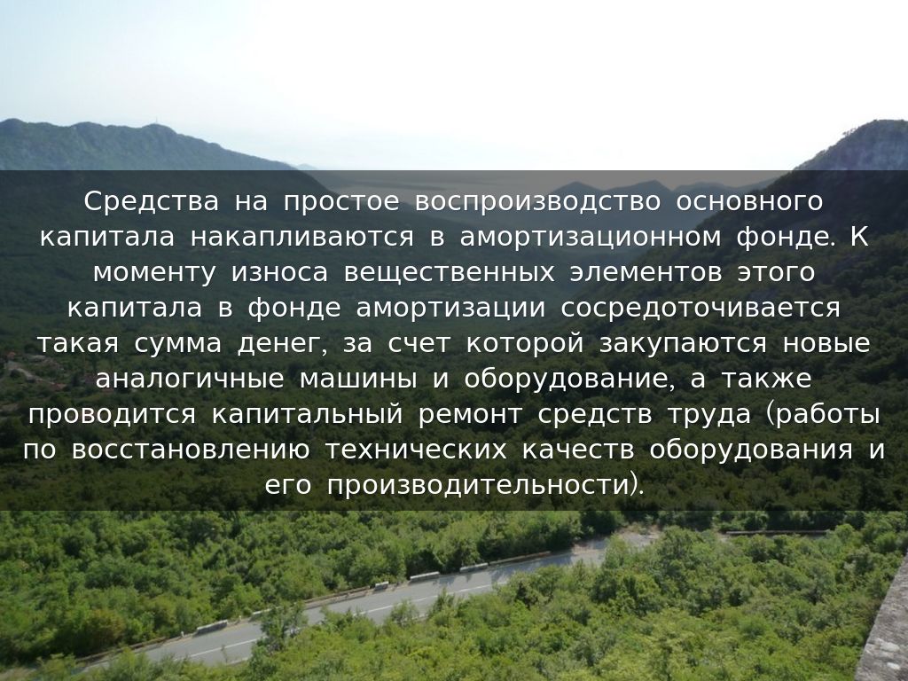 Средства на простое воспроизводство основного капитала накапливаются в амортизационном фонде. К моменту износа вещественных элементов этого капитала в фонде амортизации сосредоточивается такая сумма денег, за счет которой закупаются новые аналогичные машины и оборудование, а также проводится капитальный ремонт средств труда (работы по восстановлению технических качеств оборудования и его производительности).