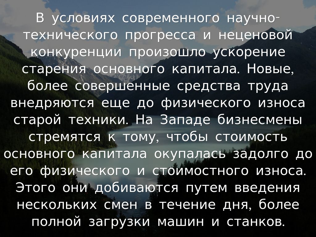 В условиях современного научно-технического прогресса и неценовой конкуренции произошло ускорение старения основного капитала. Новые, более совершенные средства труда внедряются еще до физического износа старой техники. На Западе бизнесмены стремятся к тому, чтобы стоимость основного капитала окупалась задолго до его физического и стоимостного износа. Этого они добиваются путем введения нескольких смен в течение дня, более полной загрузки машин и станков.
