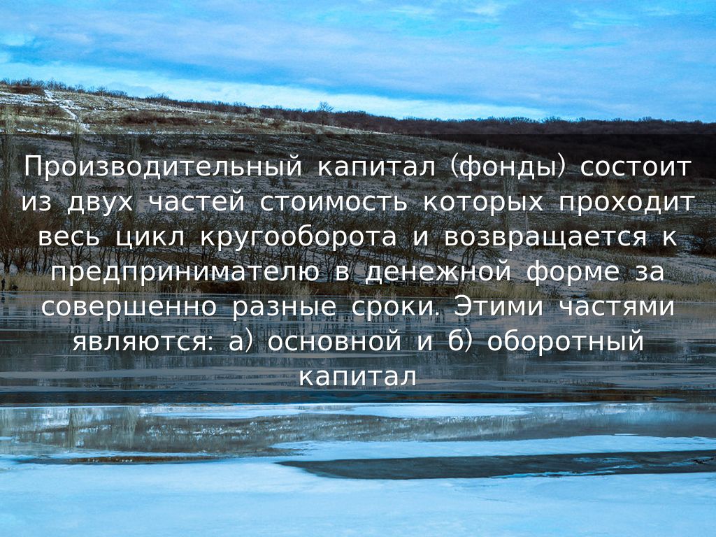 Производительный капитал (фонды) состоит из двух частей стоимость которых проходит весь цикл кругооборота и возвращается к предпринимателю в денежной форме за совершенно разные сроки. Этими частями являются: а) основной и б) оборотный капитал