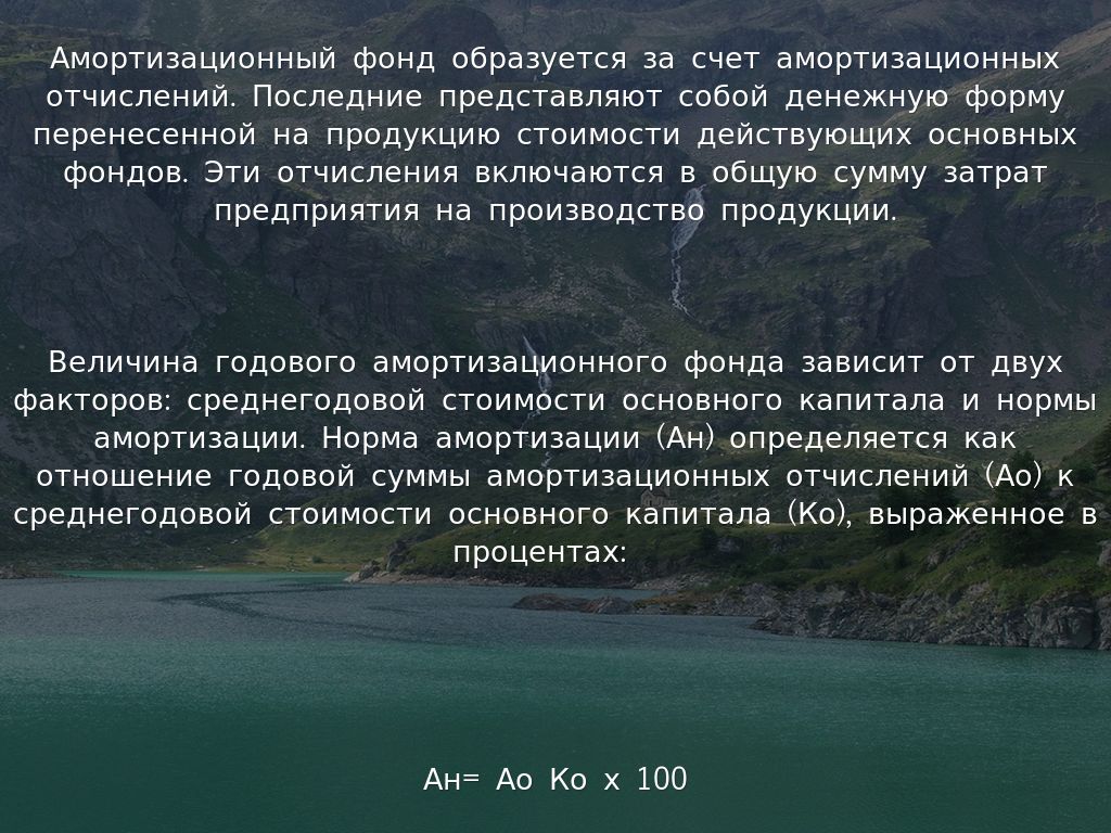 Величина годового амортизационного фонда зависит от двух факторов: среднегодовой стоимости основного капитала и нормы амортизации. Норма амортизации (Ан) определяется как отношение годовой суммы амортизационных отчислений (Ао) к среднегодовой стоимости основного капитала (Ко), выраженное в процентах: