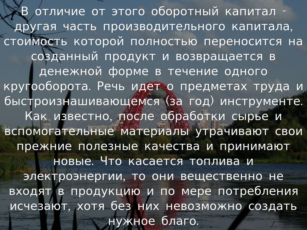 В отличие от этого оборотный капитал - другая часть производительного капитала, стоимость которой полностью переносится на созданный продукт и возвращается в денежной форме в течение одного кругооборота. Речь идет о предметах труда и быстроизнашивающемся (за год) инструменте. Как известно, после обработки сырье и вспомогательные материалы утрачивают свои прежние полезные качества и принимают новые. Что касается топлива и электроэнергии, то они вещественно не входят в продукцию и по мере потребления исчезают, хотя без них невозможно создать нужное благо.