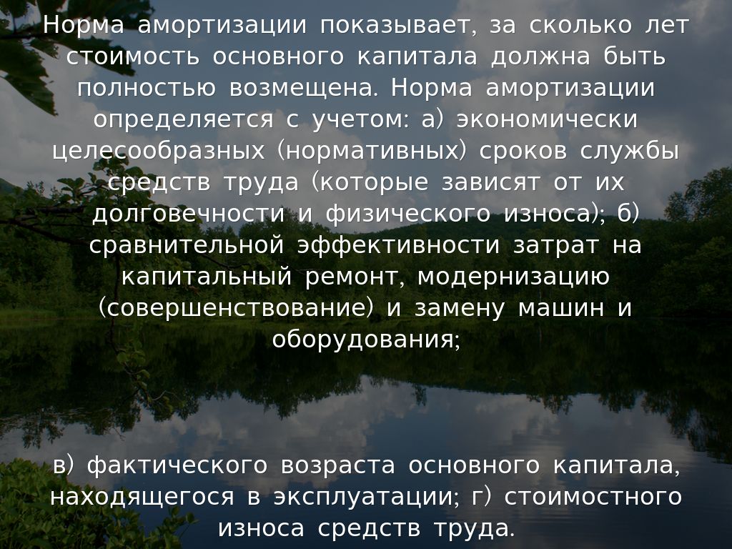 Норма амортизации показывает, за сколько лет стоимость основного капитала должна быть полностью возмещена. Норма амортизации определяется с учетом: а) экономически целесообразных (нормативных) сроков службы средств труда (которые зависят от их долговечности и физического износа); б) сравнительной эффективности затрат на капитальный ремонт, модернизацию (совершенствование) и замену машин и оборудования;