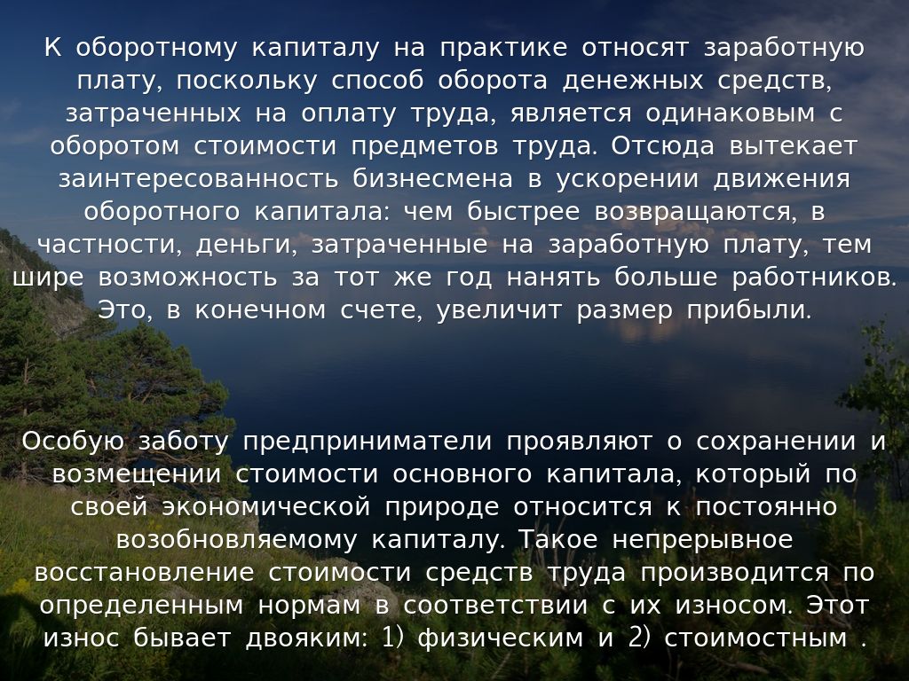 К оборотному капиталу на практике относят заработную плату, поскольку способ оборота денежных средств, затраченных на оплату труда, является одинаковым с оборотом стоимости предметов труда. Отсюда вытекает заинтересованность бизнесмена в ускорении движения оборотного капитала: чем быстрее возвращаются, в частности, деньги, затраченные на заработную плату, тем шире возможность за тот же год нанять больше работников. Это, в конечном счете, увеличит размер прибыли.