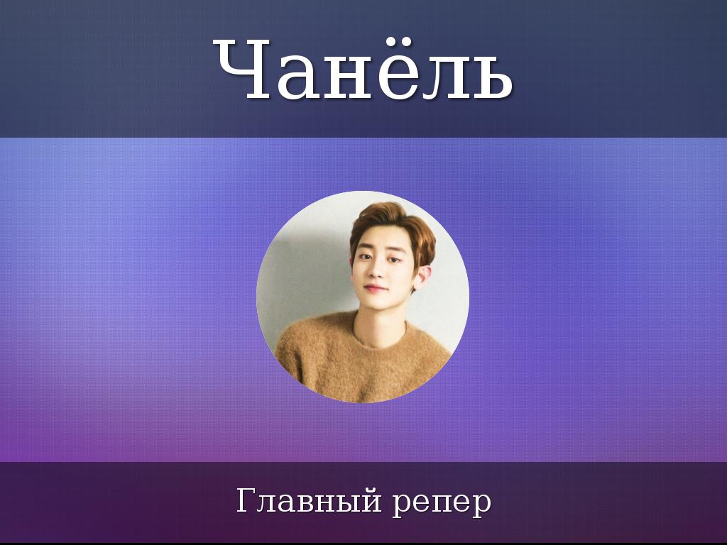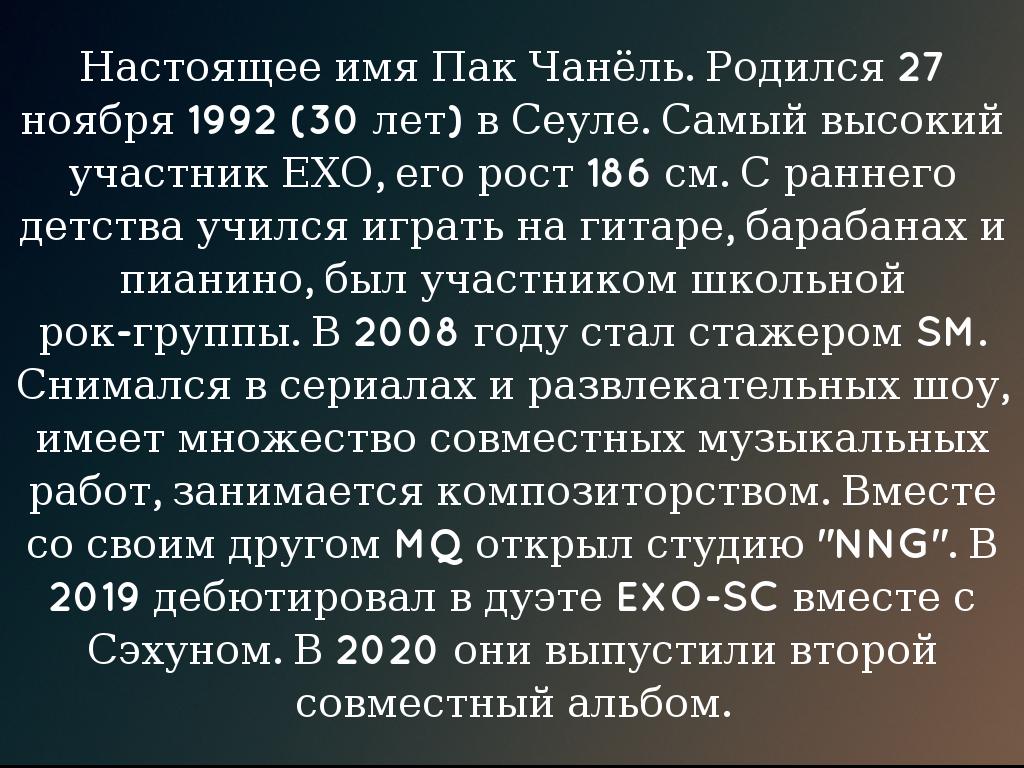 Настоящее имя Пак Чанёль. Родился 27 ноября 1992 (30 лет) в Сеуле. Самый высокий участник ЕХО, его рост 186 см. С раннего детства учился играть на гитаре, барабанах и пианино, был участником школьной рок-группы. В 2008 году стал стажером SM. Снимался в сериалах и развлекательных шоу, имеет множество совместных музыкальных работ, занимается композиторством. Вместе со своим другом MQ открыл студию "NNG". В 2019 дебютировал в дуэте EXO-SC вместе с Сэхуном. В 2020 они выпустили второй совместный альбом.