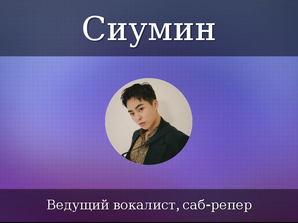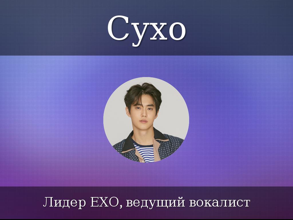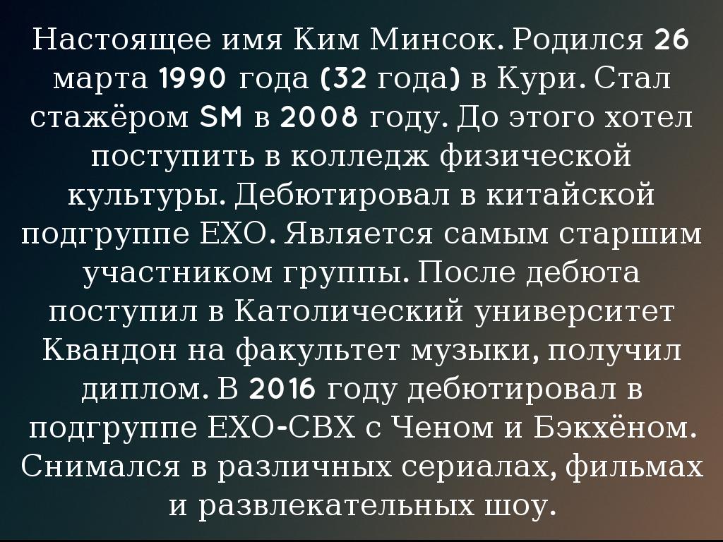Настоящее имя Ким Минсок. Родился 26 марта 1990 года (32 года) в Кури. Стал стажёром SM в 2008 году. До этого хотел поступить в колледж физической культуры. Дебютировал в китайской подгруппе ЕХО. Является самым старшим участником группы. После дебюта поступил в Католический университет Квандон на факультет музыки, получил диплом. В 2016 году дебютировал в подгруппе ЕХО-СВХ с Ченом и Бэкхёном. Снимался в различных сериалах, фильмах и развлекательных шоу.