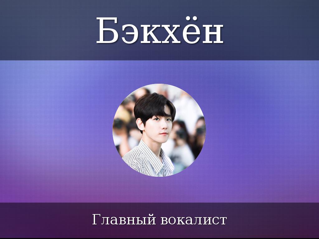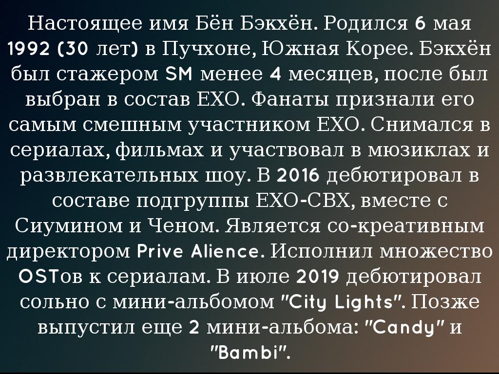 Настоящее имя Бён Бэкхён. Родился 6 мая 1992 (30 лет) в Пучхоне, Южная Корее. Бэкхён был стажером SM менее 4 месяцев, после был выбран в состав ЕХО. Фанаты признали его самым смешным участником ЕХО. Снимался в сериалах, фильмах и участвовал в мюзиклах и развлекательных шоу. В 2016 дебютировал в составе подгруппы ЕХО-СВХ, вместе с Сиумином и Ченом. Является со-креативным директором Prive Alience. Исполнил множество OSTов к сериалам. В июле 2019 дебютировал сольно с мини-альбомом "City Lights". Позже выпустил еще 2 мини-альбома: "Candy" и "Bambi".