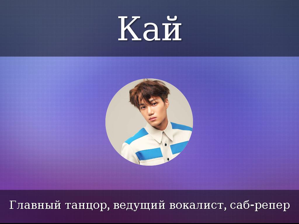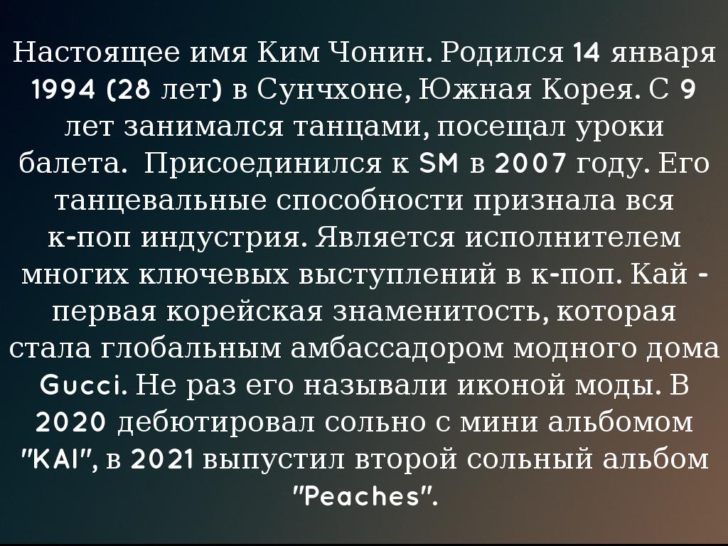 Настоящее имя Ким Чонин. Родился 14 января 1994 (28 лет) в Сунчхоне, Южная Корея. С 9 лет занимался танцами, посещал уроки балета. Присоединился к SM в 2007 году. Его танцевальные способности признала вся к-поп индустрия. Является исполнителем многих ключевых выступлений в к-поп. Кай - первая корейская знаменитость, которая стала глобальным амбассадором модного дома Gucci. Не раз его называли иконой моды. В 2020 дебютировал сольно с мини альбомом "KAI", в 2021 выпустил второй сольный альбом "Peaches".