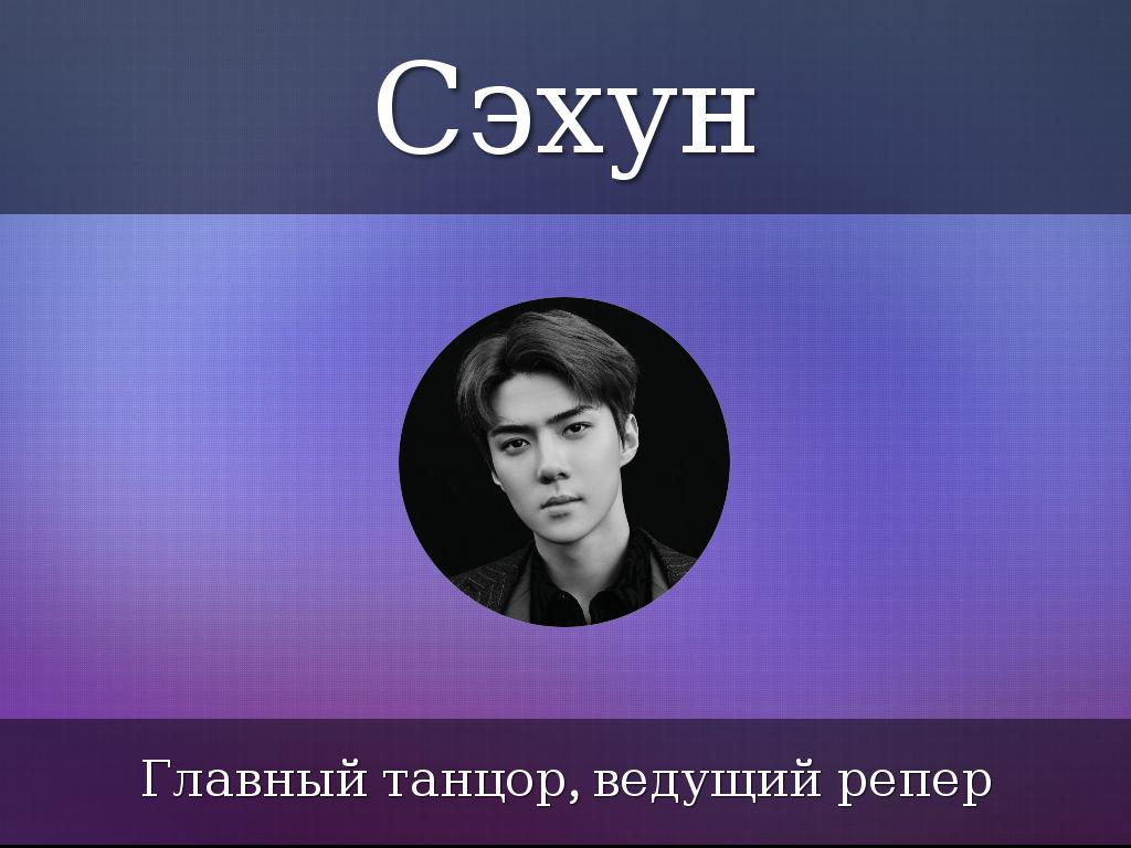 Настоящее имя О Сэхун. Родился 12 апреля 1994 (29 лет) в Сеуле. Самый младший участник группы. Стал стажером SM в 2008 году. До присоединения к агентству он не интересовался пением и танцами. Признан одним из самых красивых айдолов. Также многие дома моды уделяли ему свое внимание. Louis Vuitton называли его "самым стильным мужчиной". Снимался в развлекательных шоу и сериалах. В 2019 дебютировал в дуэте EXO-SC вместе с Чанёлем с мини-альбомом "What a life". В 2020 они выпустили второй мини-альбом "1 billion views".