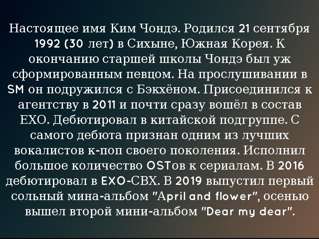 Настоящее имя Ким Чондэ. Родился 21 сентября 1992 (30 лет) в Сихыне, Южная Корея. К окончанию старшей школы Чондэ был уж сформированным певцом. На прослушивании в SM он подружился с Бэкхёном. Присоединился к агентству в 2011 и почти сразу вошёл в состав ЕХО. Дебютировал в китайской подгруппе. С самого дебюта признан одним из лучших вокалистов к-поп своего поколения. Исполнил большое количество OSTов к сериалам. В 2016 дебютировал в EXO-СВХ. В 2019 выпустил первый сольный мина-альбом "Аpril and flower", осенью вышел второй мини-альбом "Dear my dear".