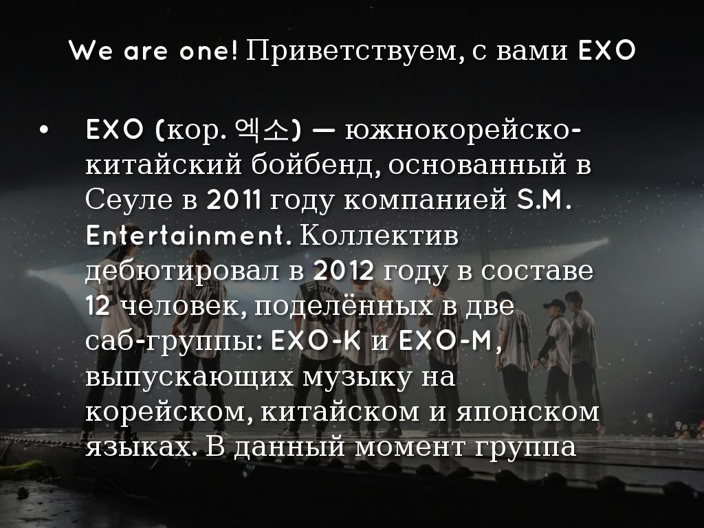 • EXO (кор. 엑소) — южнокорейско-китайский бойбенд, основанный в Сеуле в 2011 году компанией S.M. Entertainment. Коллектив дебютировал в 2012 году в составе 12 человек, поделённых в две саб-группы: EXO-K и EXO-M, выпускающих музыку на корейском, китайском и японском языках. В данный момент группа состоит из девяти участников.