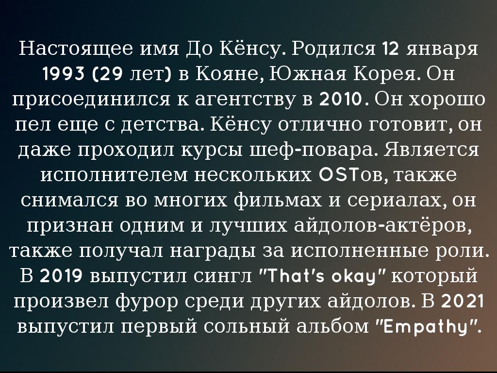 Настоящее имя До Кёнсу. Родился 12 января 1993 (29 лет) в Кояне, Южная Корея. Он присоединился к агентству в 2010. Он хорошо пел еще с детства. Кёнсу отлично готовит, он даже проходил курсы шеф-повара. Является исполнителем нескольких OSTов, также снимался во многих фильмах и сериалах, он признан одним и лучших айдолов-актёров, также получал награды за исполненные роли. В 2019 выпустил сингл "That's okay" который произвел фурор среди других айдолов. В 2021 выпустил первый сольный альбом "Empathy".