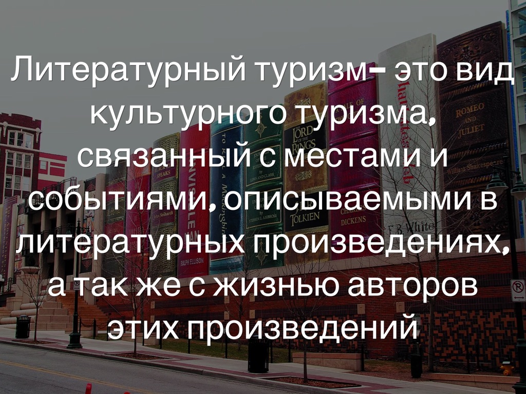 Литературный туризм- это вид культурного туризма, связанный с местами и событиями, описываемыми в литературных произведениях, а так же с жизнью авторов этих произведений