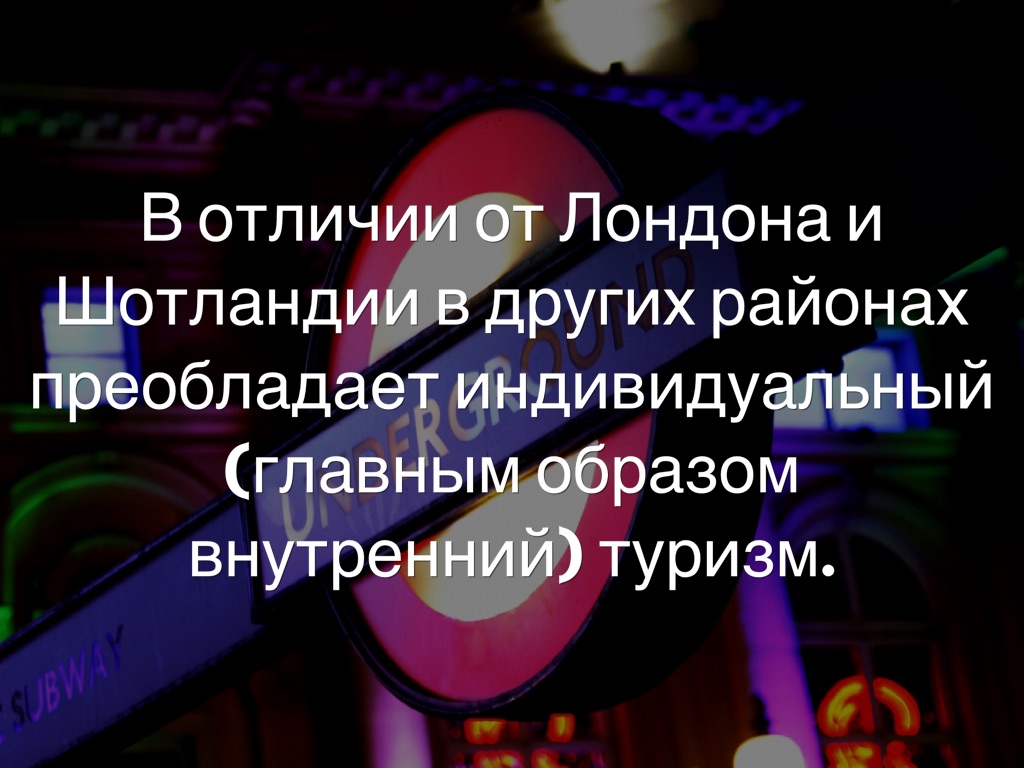 В отличии от Лондона и Шотландии в других районах преобладает индивидуальный (главным образом внутренний) туризм.
