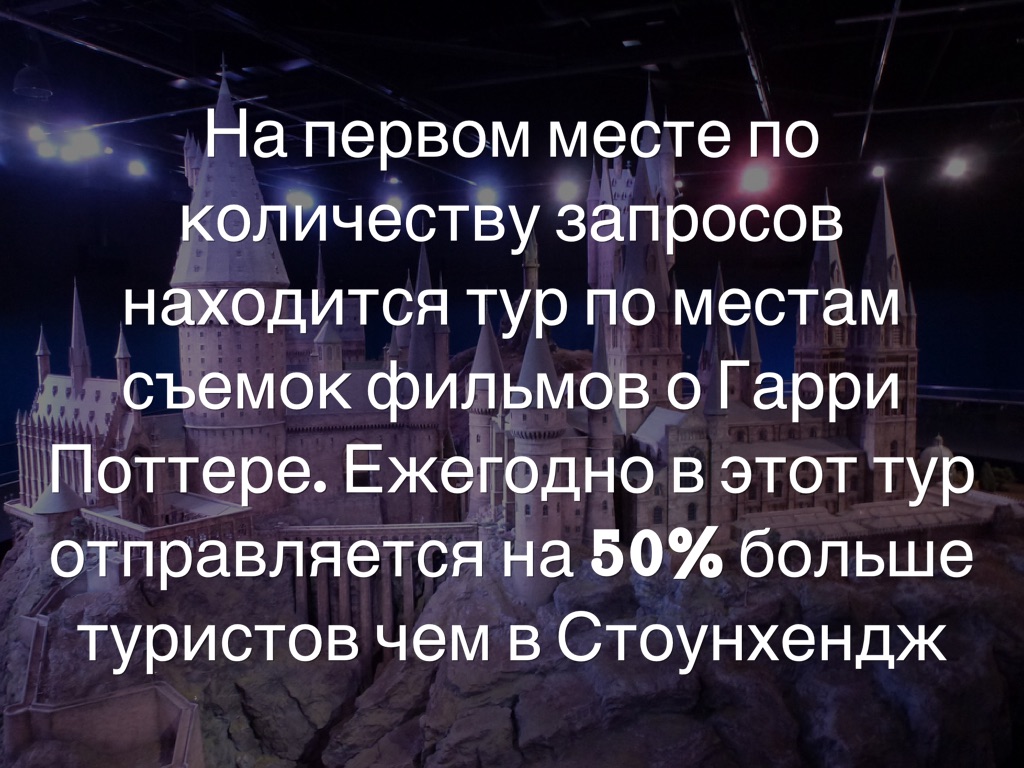 На первом месте по количеству запросов находится тур по местам съемок фильмов о Гарри Поттере. Ежегодно в этот тур отправляется на 50% больше туристов чем в Стоунхендж