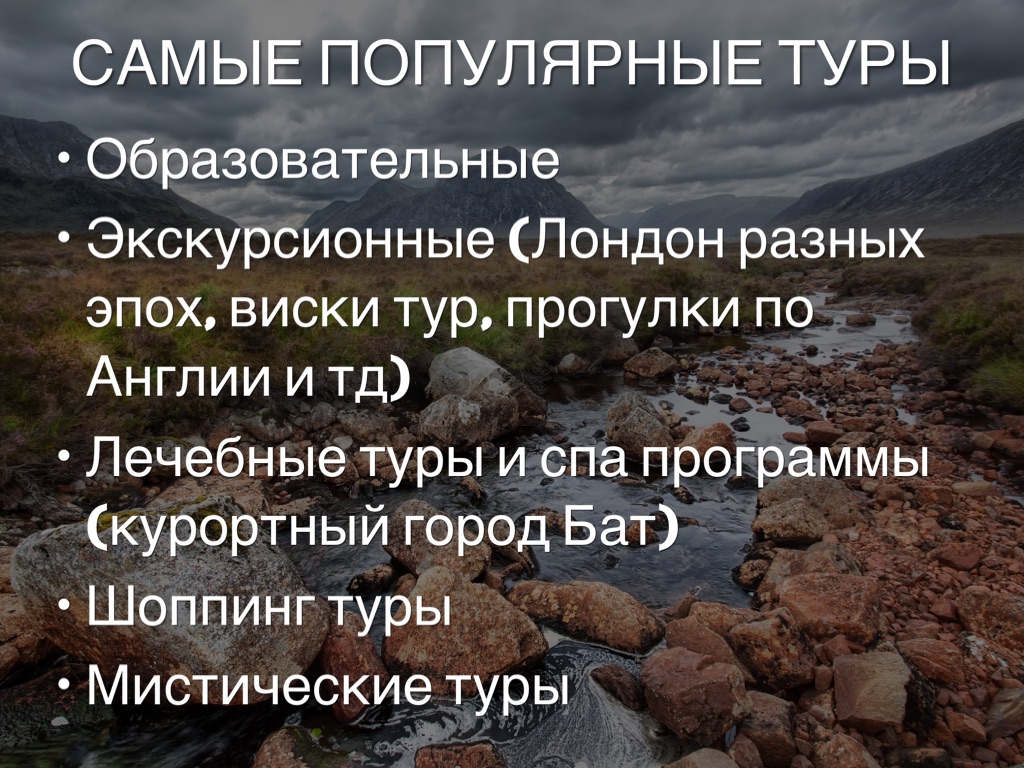 - Экскурсионные (Лондон разных эпох, виски тур, прогулки по Англии и тд)