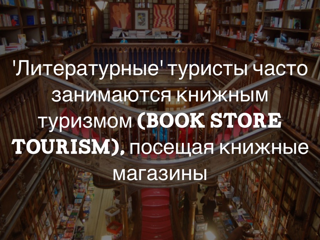 'Литературные' туристы часто занимаются книжным туризмом (book store tourism), посещая книжные магазины
