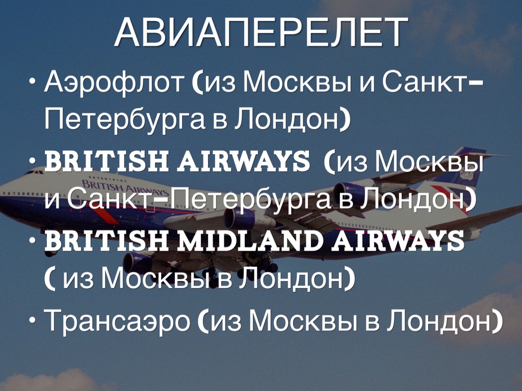 - Аэрофлот (из Москвы и Санкт-Петербурга в Лондон)