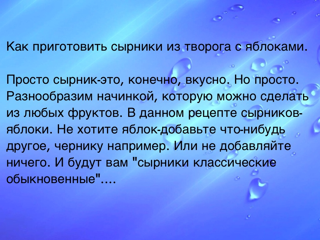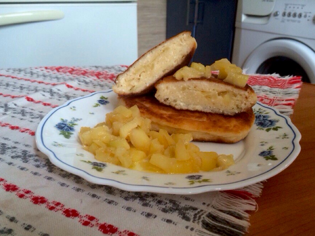 Просто сырник-это, конечно, вкусно. Но просто. Разнообразим начинкой, которую можно сделать из любых фруктов. В данном рецепте сырников-яблоки. Не хотите яблок-добавьте что-нибудь другое, чернику например. Или не добавляйте ничего. И будут вам "сырники классические обыкновенные".