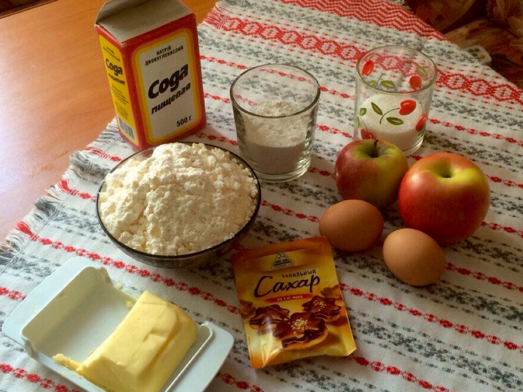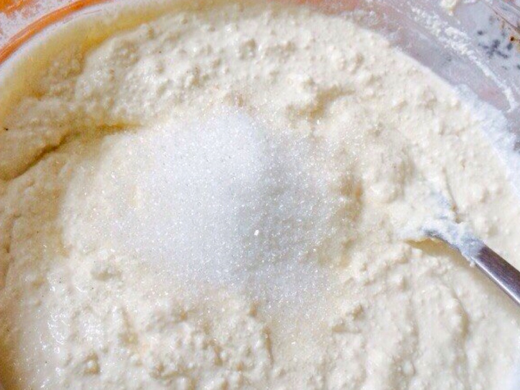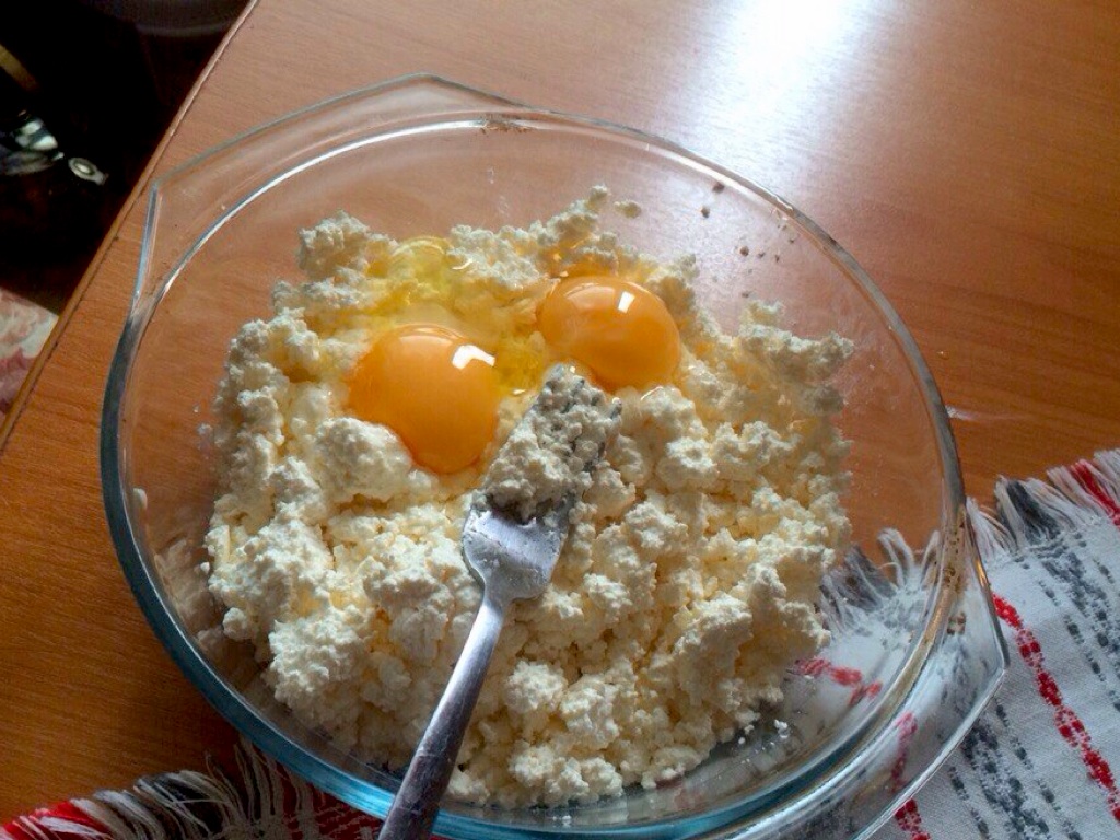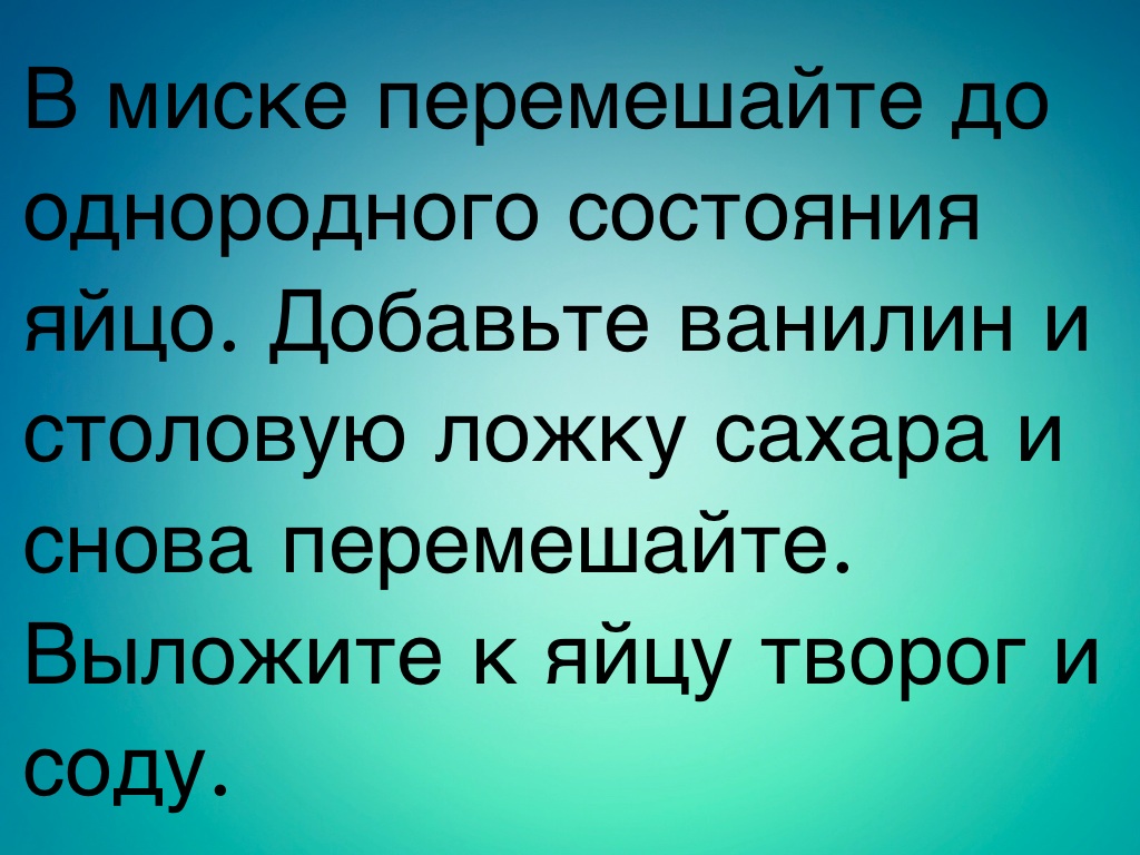 В миске перемешайте до однородного состояния яйцо. Добавьте ванилин и столовую ложку сахара и снова перемешайте. Выложите к яйцу творог и соду.