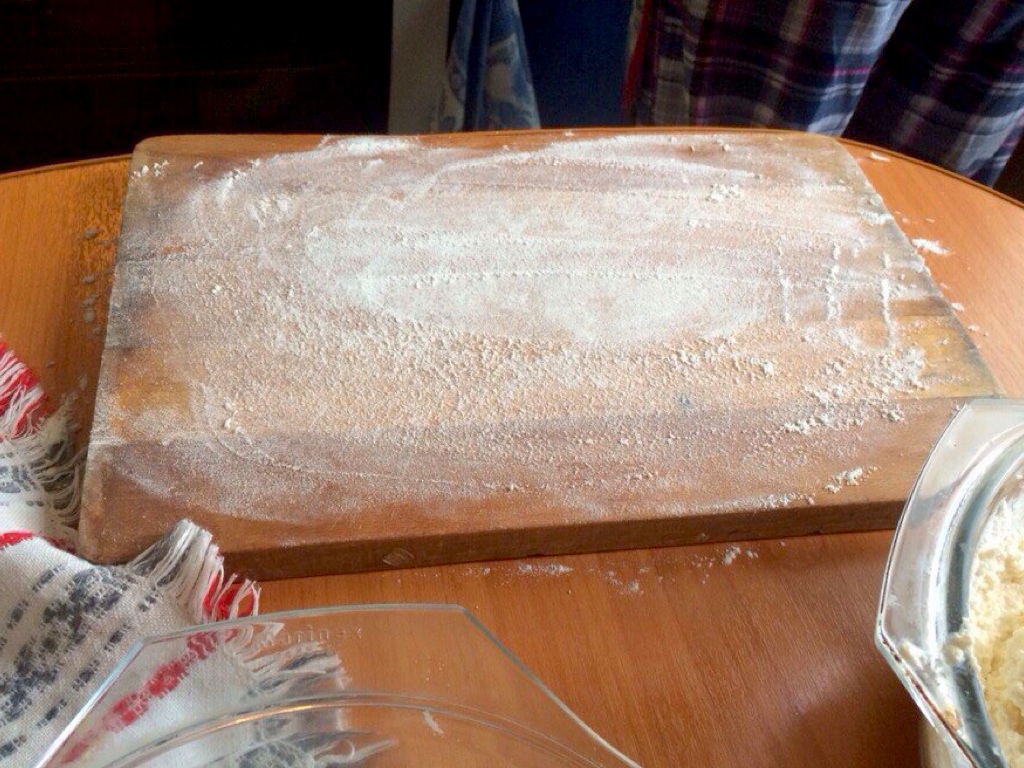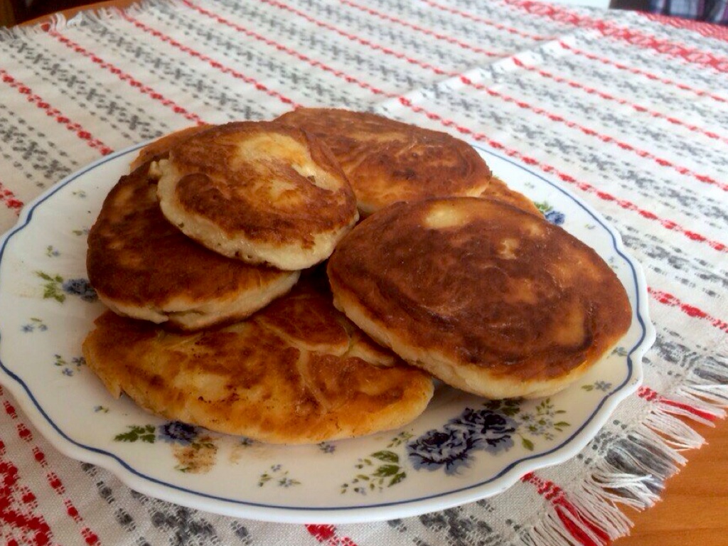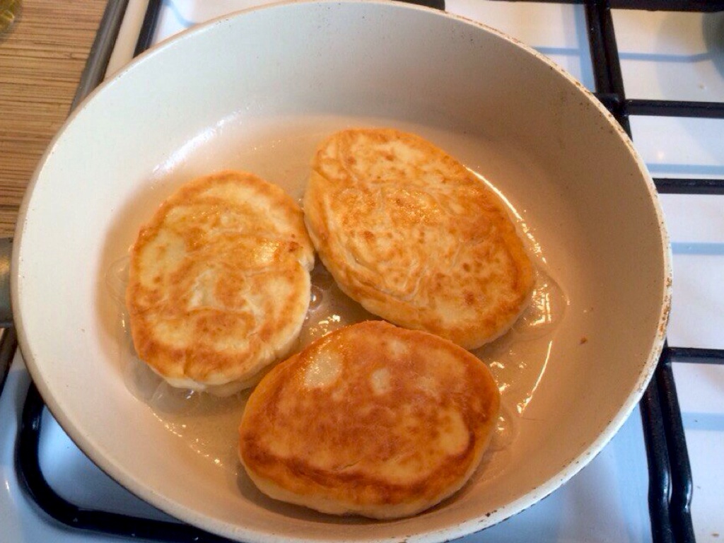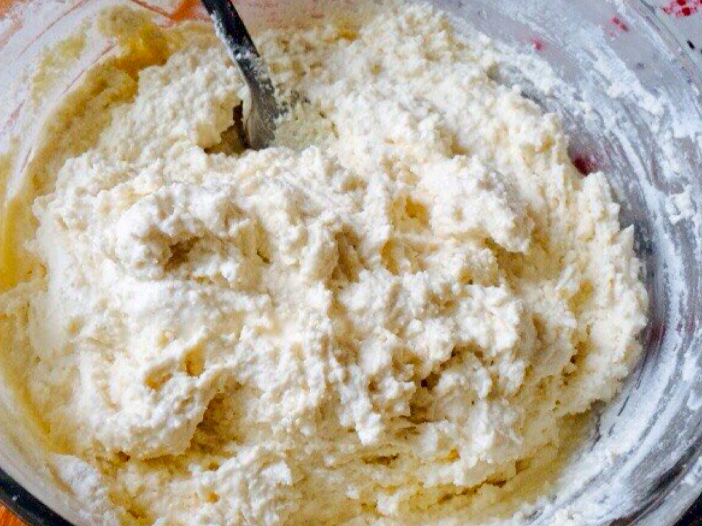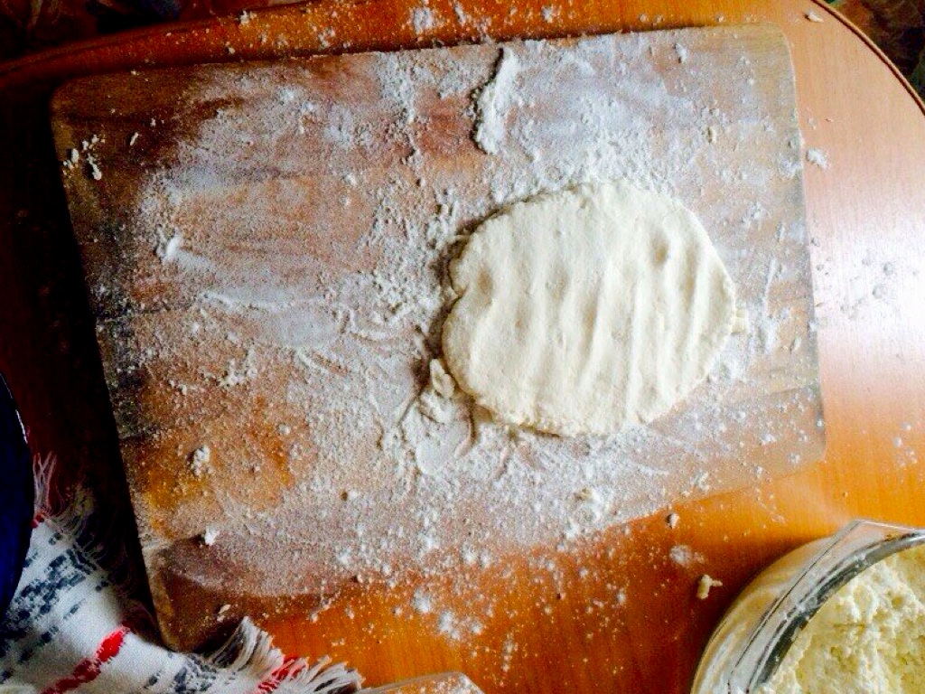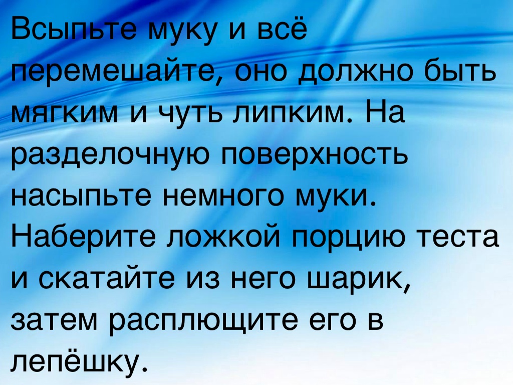 Всыпьте муку и всё перемешайте, оно должно быть мягким и чуть липким. На разделочную поверхность насыпьте немного муки. Наберите ложкой порцию теста и скатайте из него шарик, затем расплющите его в лепёшку.