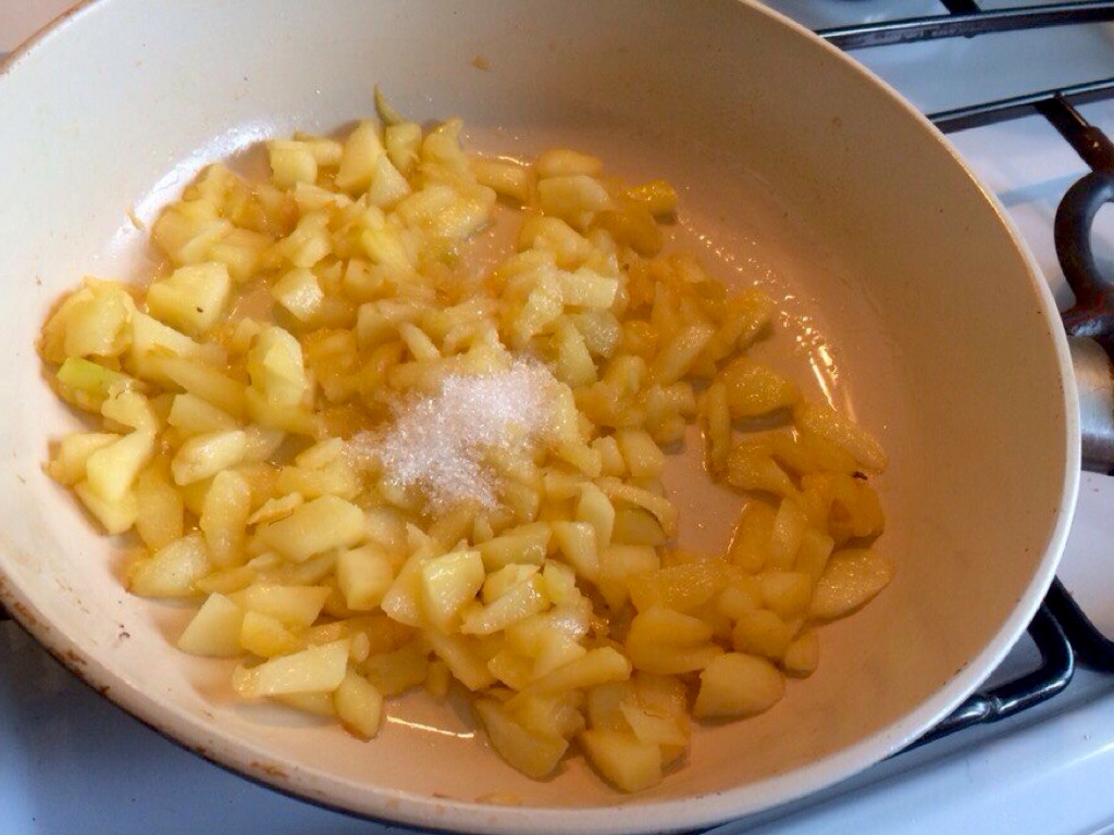 Сначала приготовьте начинку, так как ей нужно остыть до состояния, когда сливочное масло перестанет быть жидким. Яблочко очистите и нарежьте небольшими кусочками. Под жарьте на сливочном масле. В конце добавьте 1/2 столовой ложки сахара(ванильного сахара), перемешайте и снимите с огня.