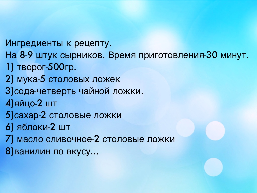 На 8-9 штук сырников. Время приготовления-30 минут.