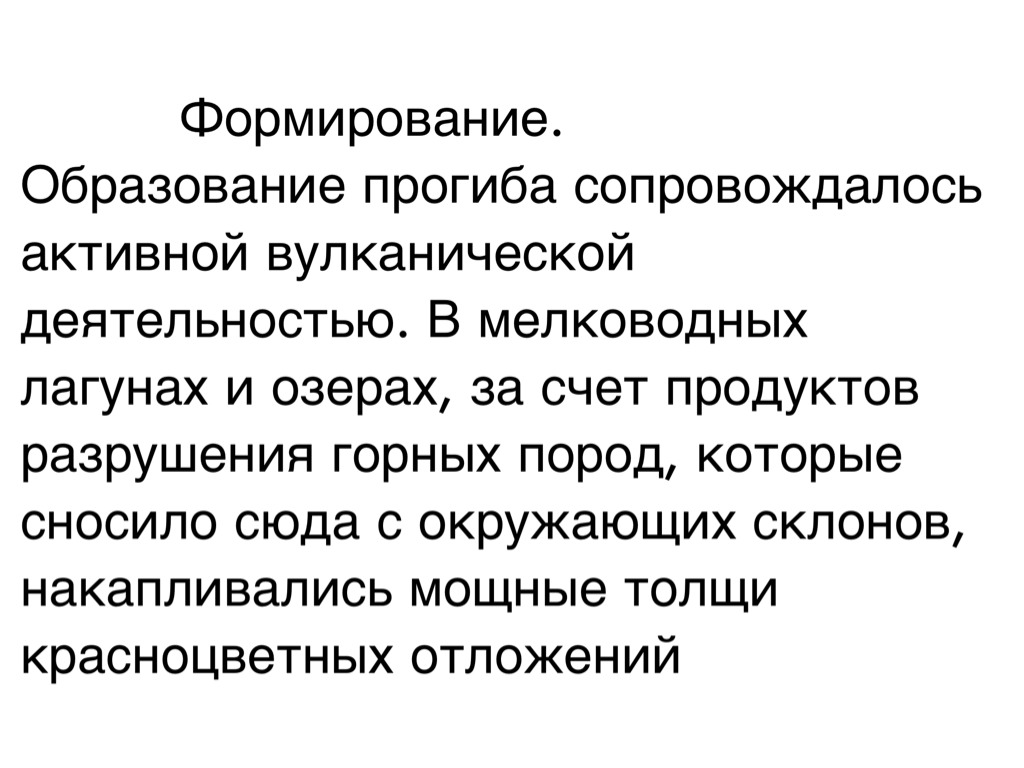 Образование прогиба сопровождалось активной вулканической деятельностью. В мелководных лагунах и озерах, за счет продуктов разрушения горных пород, которые сносило сюда с окружающих склонов, накапливались мощные толщи красноцветных отложений