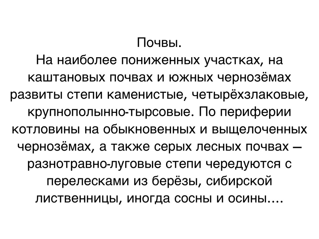 На наиболее пониженных участках, на каштановых почвах и южных чернозёмах развиты степи каменистые, четырёхзлаковые, крупнополынно-тырсовые. По периферии котловины на обыкновенных и выщелоченных чернозёмах, а также серых лесных почвах — разнотравно-луговые степи чередуются с перелесками из берёзы, сибирской лиственницы, иногда сосны и осины.