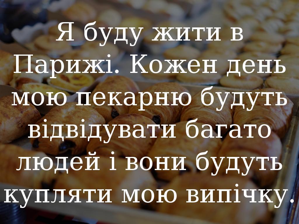 Я буду жити в Парижі. Кожен день мою пекарню будуть відвідувати багато людей і вони будуть купляти мою випічку.