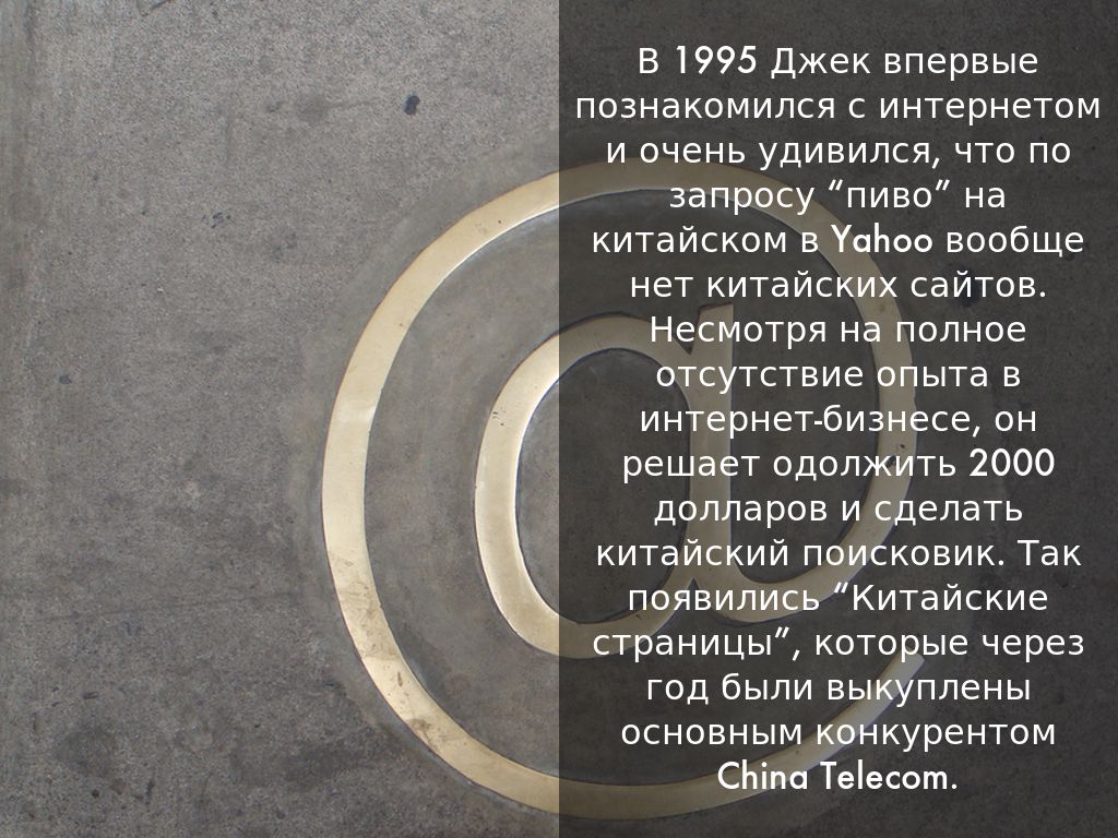 В 1995 Джек впервые познакомился с интернетом и очень удивился, что по запросу “пиво” на китайском в Yahoo вообще нет китайских сайтов. Несмотря на полное отсутствие опыта в интернет-бизнесе, он решает одолжить 2000 долларов и сделать китайский поисковик. Так появились “Китайские страницы”, которые через год были выкуплены основным конкурентом China Telecom.