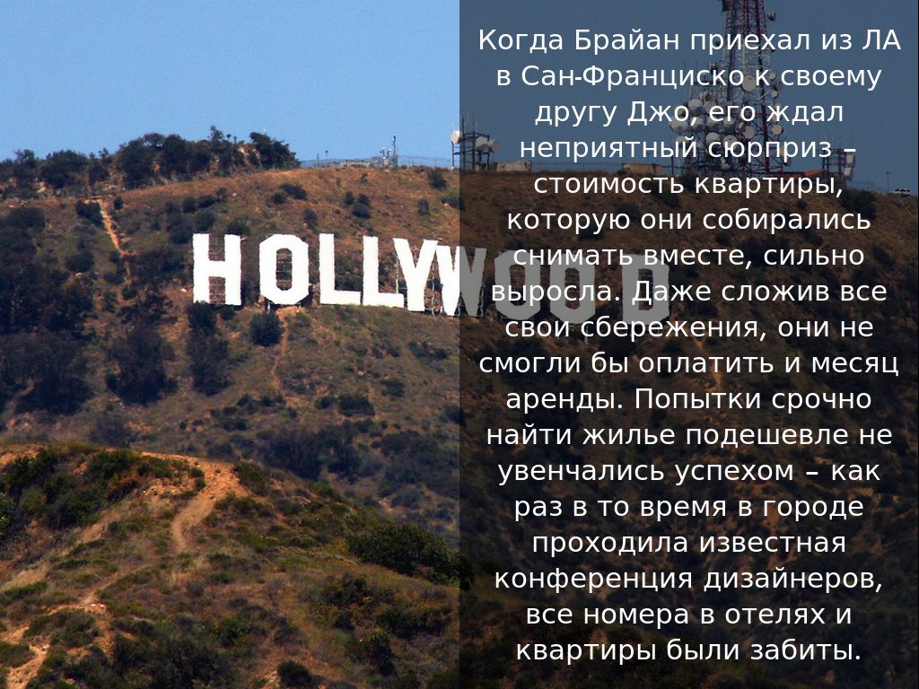 Когда Брайан приехал из ЛА в Сан-Франциско к своему другу Джо, его ждал неприятный сюрприз – стоимость квартиры, которую они собирались снимать вместе, сильно выросла. Даже сложив все свои сбережения, они не смогли бы оплатить и месяц аренды. Попытки срочно найти жилье подешевле не увенчались успехом – как раз в то время в городе проходила известная конференция дизайнеров, все номера в отелях и квартиры были забиты.