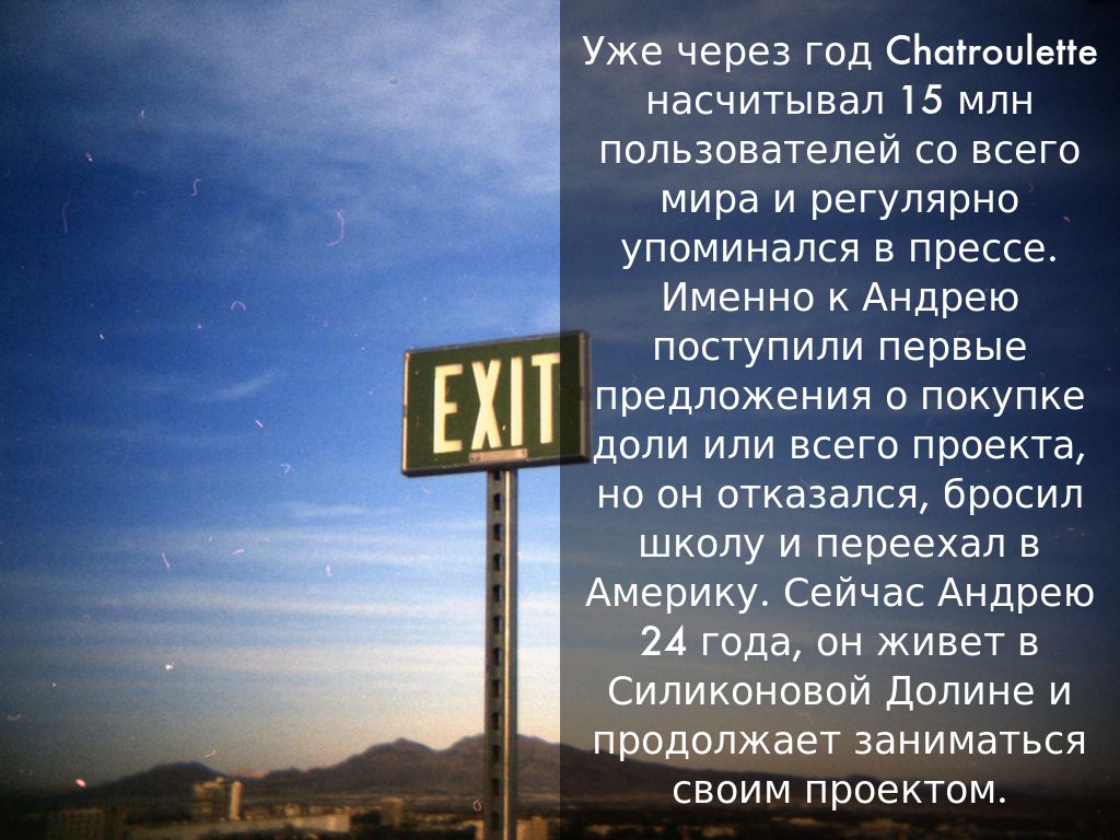 Уже через год Chatroulette насчитывал 15 млн пользователей со всего мира и регулярно упоминался в прессе. Именно к Андрею поступили первые предложения о покупке доли или всего проекта, но он отказался, бросил школу и переехал в Америку. Сейчас Андрею 24 года, он живет в Силиконовой Долине и продолжает заниматься своим проектом.