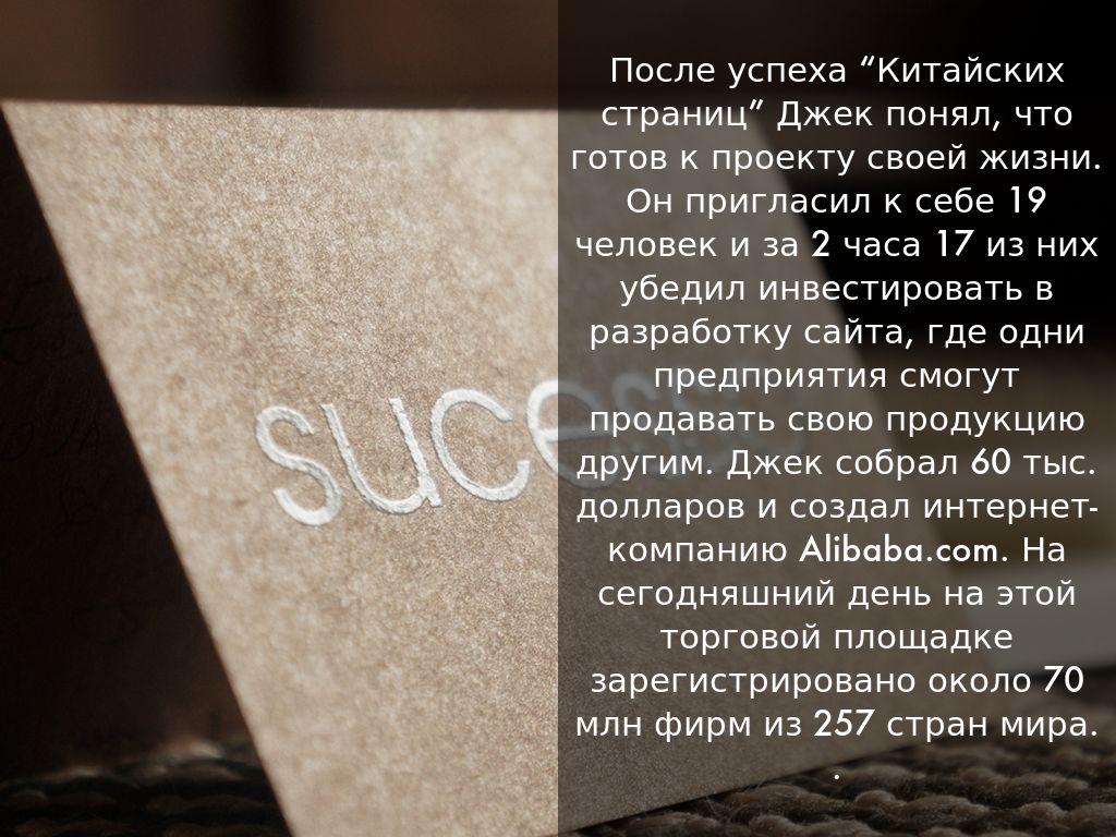 После успеха “Китайских страниц” Джек понял, что готов к проекту своей жизни. Он пригласил к себе 19 человек и за 2 часа 17 из них убедил инвестировать в разработку сайта, где одни предприятия смогут продавать свою продукцию другим. Джек собрал 60 тыс. долларов и создал интернет-компанию Alibaba.com. На сегодняшний день на этой торговой площадке зарегистрировано около 70 млн фирм из 257 стран мира. .