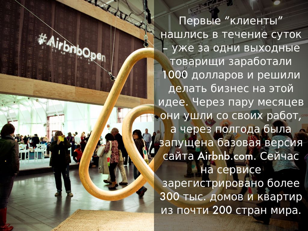 Первые “клиенты” нашлись в течение суток – уже за одни выходные товарищи заработали 1000 долларов и решили делать бизнес на этой идее. Через пару месяцев они ушли со своих работ, а через полгода была запущена базовая версия сайта Airbnb.com. Сейчас на сервисе зарегистрировано более 300 тыс. домов и квартир из почти 200 стран мира.