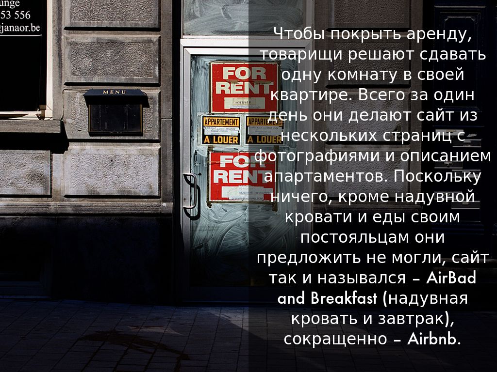 Чтобы покрыть аренду, товарищи решают сдавать одну комнату в своей квартире. Всего за один день они делают сайт из нескольких страниц с фотографиями и описанием апартаментов. Поскольку ничего, кроме надувной кровати и еды своим постояльцам они предложить не могли, сайт так и назывался – AirBad and Breakfast (надувная кровать и завтрак), сокращенно – Airbnb.