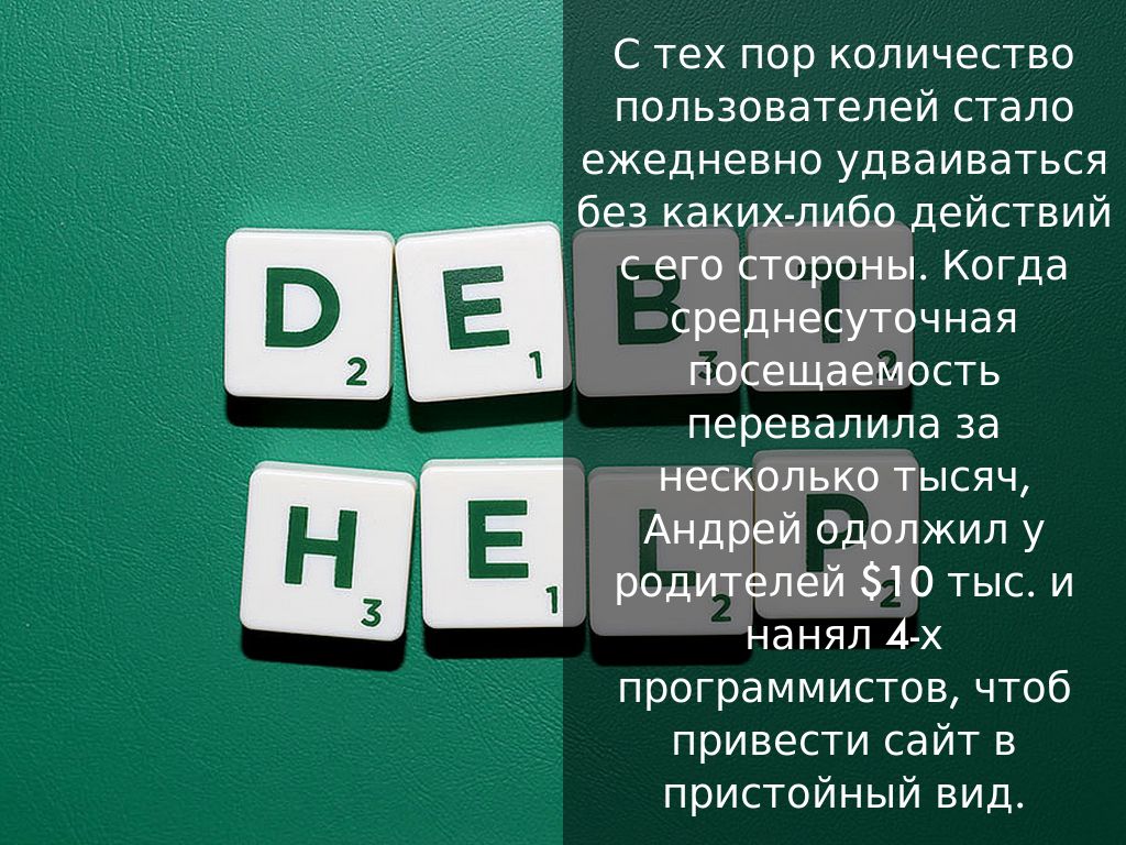 С тех пор количество пользователей стало ежедневно удваиваться без каких-либо действий с его стороны. Когда среднесуточная посещаемость перевалила за несколько тысяч, Андрей одолжил у родителей $10 тыс. и нанял 4-х программистов, чтоб привести сайт в пристойный вид.