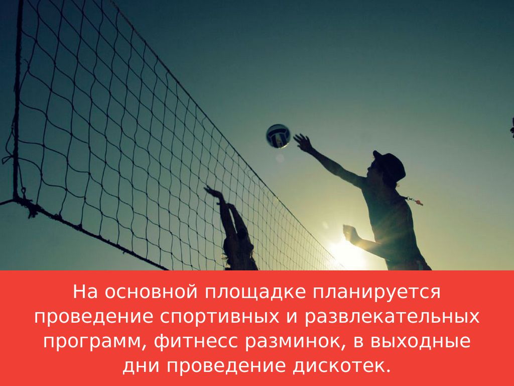 На основной площадке планируется проведение спортивных и развлекательных программ, фитнесс разминок, в выходные дни проведение дискотек.