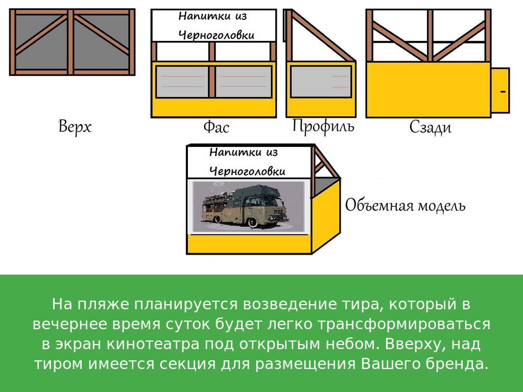 На пляже планируется возведение тира, который в вечернее время суток будет легко трансформироваться в экран кинотеатра под открытым небом. Вверху, над тиром имеется секция для размещения Вашего бренда.