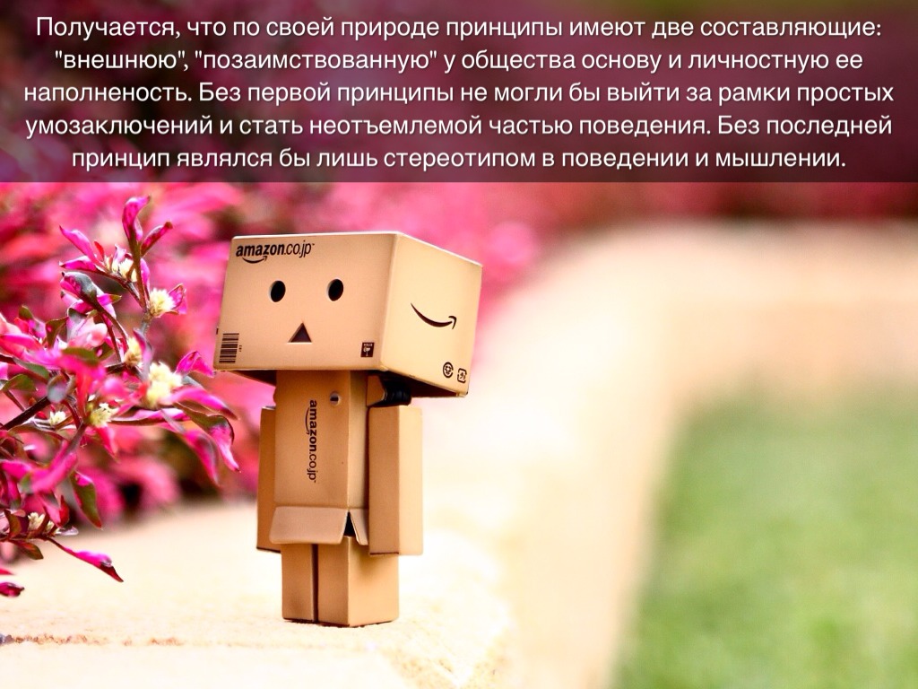 Получается, что по своей природе принципы имеют две составляющие: "внешнюю", "позаимствованную" у общества основу и личностную ее наполненость. Без первой принципы не могли бы выйти за рамки простых умозаключений и стать неотъемлемой частью поведения. Без последней принцип являлся бы лишь стереотипом в поведении и мышлении.