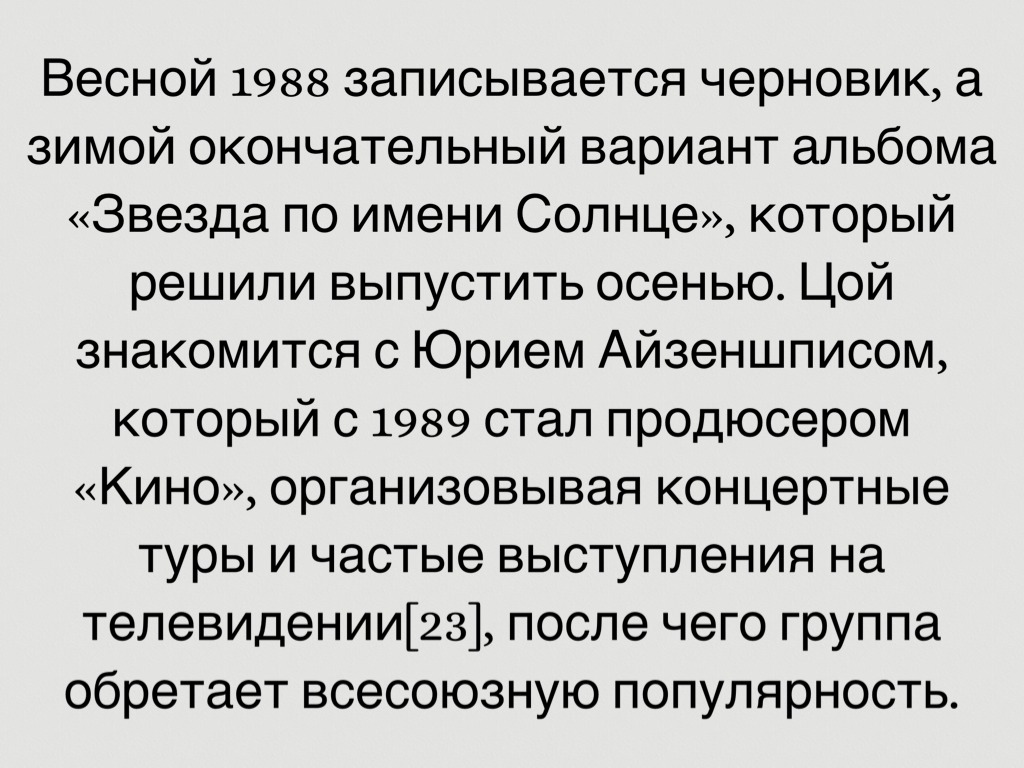 Весной 1988 записывается черновик, а зимой окончательный вариант альбома «Звезда по имени Солнце», который решили выпустить осенью. Цой знакомится с Юрием Айзеншписом, который с 1989 стал продюсером «Кино», организовывая концертные туры и частые выступления на телевидении[23], после чего группа обретает всесоюзную популярность.
