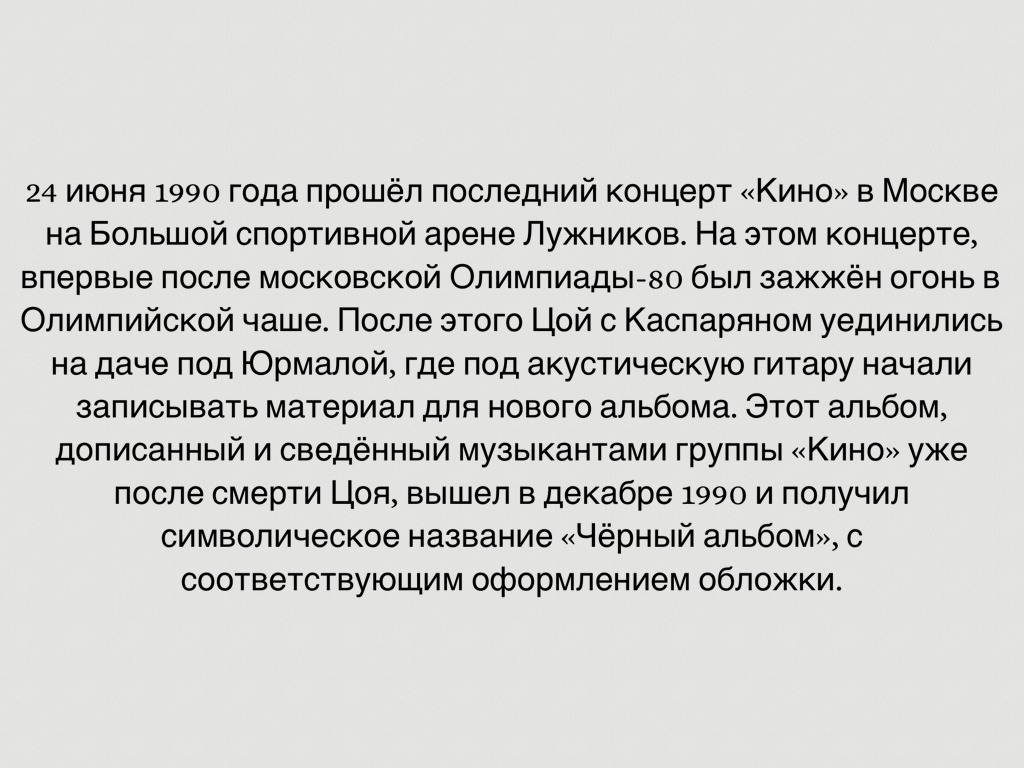 24 июня 1990 года прошёл последний концерт «Кино» в Москве на Большой спортивной арене Лужников. На этом концерте, впервые после московской Олимпиады-80 был зажжён огонь в Олимпийской чаше. После этого Цой с Каспаряном уединились на даче под Юрмалой, где под акустическую гитару начали записывать материал для нового альбома. Этот альбом, дописанный и сведённый музыкантами группы «Кино» уже после смерти Цоя, вышел в декабре 1990 и получил символическое название «Чёрный альбом», с соответствующим оформлением обложки.