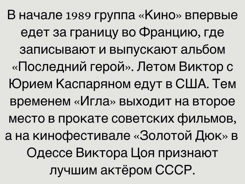 В начале 1989 группа «Кино» впервые едет за границу во Францию, где записывают и выпускают альбом «Последний герой». Летом Виктор с Юрием Каспаряном едут в США. Тем временем «Игла» выходит на второе место в прокате советских фильмов, а на кинофестивале «Золотой Дюк» в Одессе Виктора Цоя признают лучшим актёром СССР.