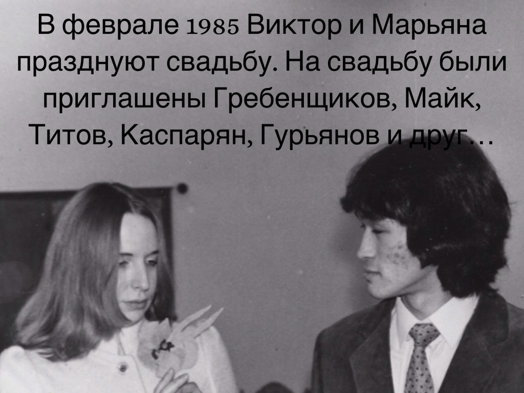 В феврале 1985 Виктор и Марьяна празднуют свадьбу. На свадьбу были приглашены Гребенщиков, Майк, Титов, Каспарян, Гурьянов и другие.