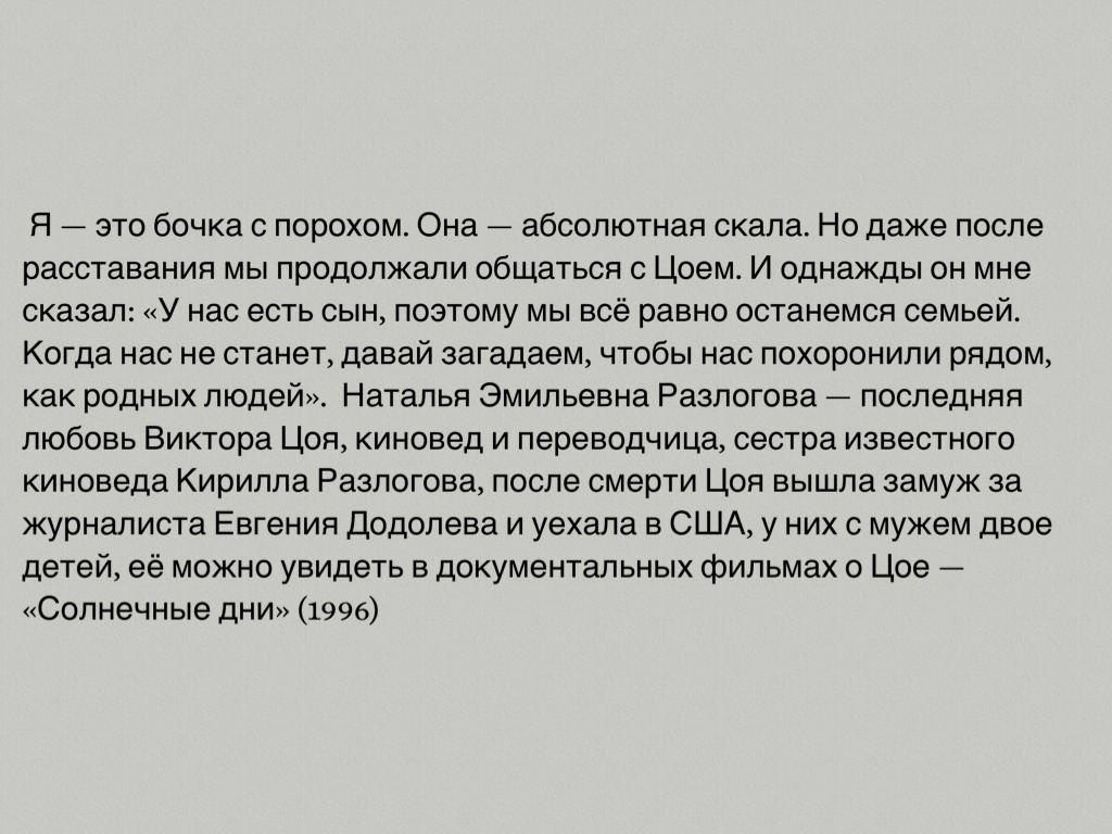 Я — это бочка с порохом. Она — абсолютная скала. Но даже после расставания мы продолжали общаться с Цоем. И однажды он мне сказал: «У нас есть сын, поэтому мы всё равно останемся семьей. Когда нас не станет, давай загадаем, чтобы нас похоронили рядом, как родных людей». Наталья Эмильевна Разлогова — последняя любовь Виктора Цоя, киновед и переводчица, сестра известного киноведа Кирилла Разлогова, после смерти Цоя вышла замуж за журналиста Евгения Додолева и уехала в США, у них с мужем двое детей, её можно увидеть в документальных фильмах о Цое — «Солнечные дни» (1996)