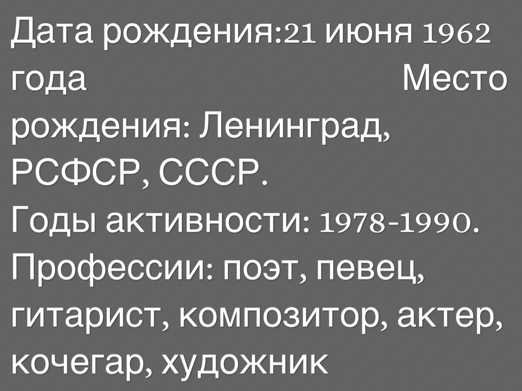 Дата рождения:21 июня 1962 года Место рождения: Ленинград, РСФСР, СССР. Годы активности: 1978-1990. Профессии: поэт, певец, гитарист, композитор, актер, кочегар, художник