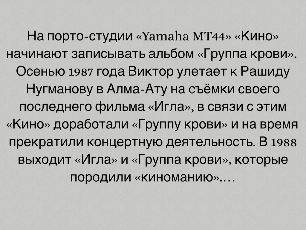 На порто-студии «Yamaha MT44» «Кино» начинают записывать альбом «Группа крови». Осенью 1987 года Виктор улетает к Рашиду Нугманову в Алма-Ату на съёмки своего последнего фильма «Игла», в связи с этим «Кино» доработали «Группу крови» и на время прекратили концертную деятельность. В 1988 выходит «Игла» и «Группа крови», которые породили «киноманию».