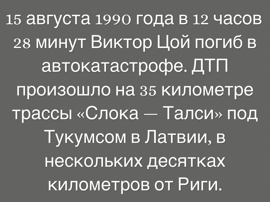 15 августа 1990 года в 12 часов 28 минут Виктор Цой погиб в автокатастрофе. ДТП произошло на 35 километре трассы «Слока — Талси» под Тукумсом в Латвии, в нескольких десятках километров от Риги.