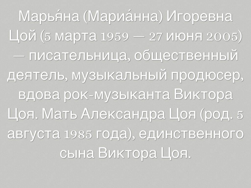 Марья́на (Мариа́нна) Игоревна Цой (5 марта 1959 — 27 июня 2005) — писательница, общественный деятель, музыкальный продюсер, вдова рок-музыканта Виктора Цоя. Мать Александра Цоя (род. 5 августа 1985 года), единственного сына Виктора Цоя.